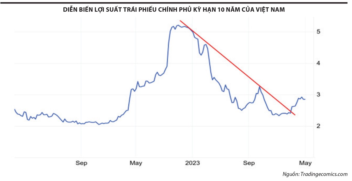 Mặc dù vậy, thị trường đang thiếu động lực để kỳ vọng cho sóng tăng mới, tình hình vĩ mô chỉ là không xấu đi, chứ không phải là tốt hơn so với trước khi VN-Index giảm mạnh. Chẳng hạn, lợi suất trái phiếu chính phủ kỳ hạn 10 năm đã phá vỡ xu hướng giảm dài hạn từ năm 2022, tức kỳ vọng của thị trường là mặt bằng lãi suất sẽ có xu hướng tăng dần trong thời gian tới. Khi lãi suất tăng lên thì những tài sản mang tính rủi ro cao như cổ phiếu sẽ bớt dồi dào thanh khoản, cũng như định giá thị trường chứng khoán bớt hấp dẫn hơn.