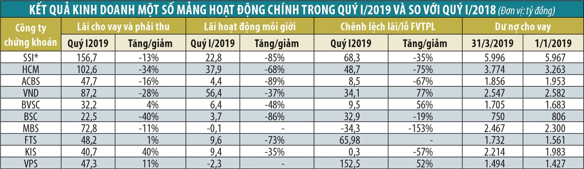 Đối với hoạt động cho vay ký quỹ, dư nợ cho vay đến cuối quý I/2019 của các CTCK nhìn chung không giảm so với đầu năm, nhưng so với cùng kỳ quý I/2018, dư nợ giảm từ 20 - 30%, khiến thu nhập từ cho vay suy giảm.