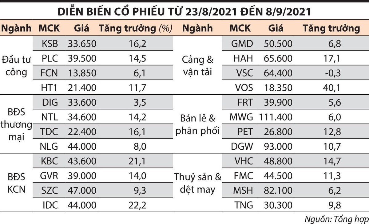 Trong đó, kể từ ngày 23/8-8/9, thị trường tiếp tục xu hướng tăng với dòng tiền tập trung chủ yếu vào nhóm cổ phiếu kỳ vọng hưởng lợi từ việc mở cửa nền kinh tế như đầu tư công; cảng và vận tải; bất động sản công nghiệp; bất động sản thương mại; bán lẻ; thuỷ sản và dệt may… Ngược lại, nhóm cổ phiếu trụ như chỉ số VN30 chỉ tăng nhẹ 1,5% lên 1.433,71 điểm.