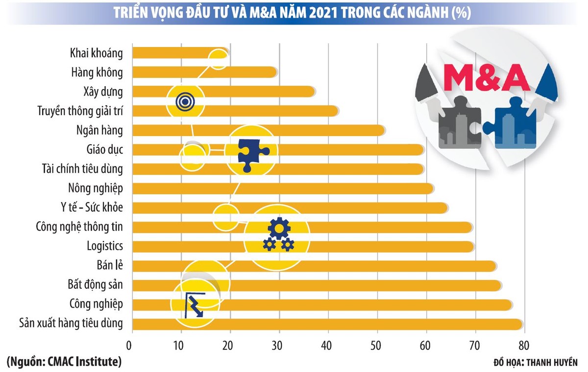 Theo Viện Nghiên cứu đầu tư và mua bán sáp nhập (CMAC), thị trường M&A Việt Nam sẽ hồi phục theo mô hình chữ V trong giai đoạn 2021 - 2022. Cụ thể, thị trường có thể phục hồi về mức 4,5 - 5 tỷ USD vào năm 2021 trước khi bật mạnh hơn, trở lại với giá trị 7 tỷ USD vào năm 2022. Các lĩnh vực hàng tiêu dùng, bán lẻ và bất động sản, công nghiệp vẫn sẽ là tâm điểm thu hút M&A trong năm 2021.