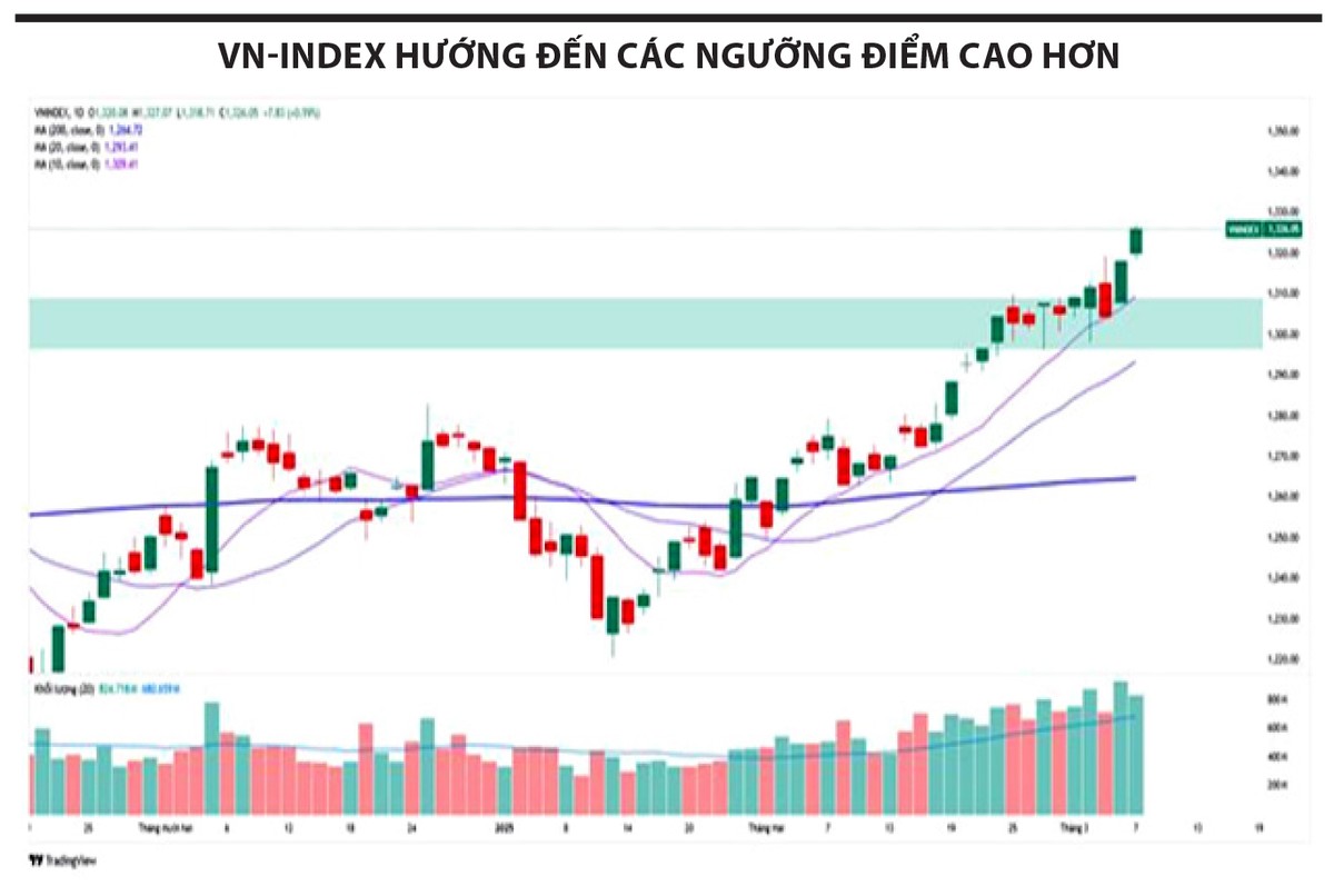 Thị trường đã thoát khỏi trạng thái giằng co quanh mốc 1,300 điểm với thanh khoản liên tục cải thiện. Dòng tiền sôi động hơn và hướng sự quan tâm đến nhóm cổ phiếu vốn hóa lớn, giúp VN-Index duy trì đà tăng. Dự kiến, dòng tiền sẽ tiếp tục luân phiên hỗ trợ, tạo động lực để chỉ số tiến đến các ngưỡng kháng cự tiếp theo tại 1.330 điểm và 1.365 điểm.