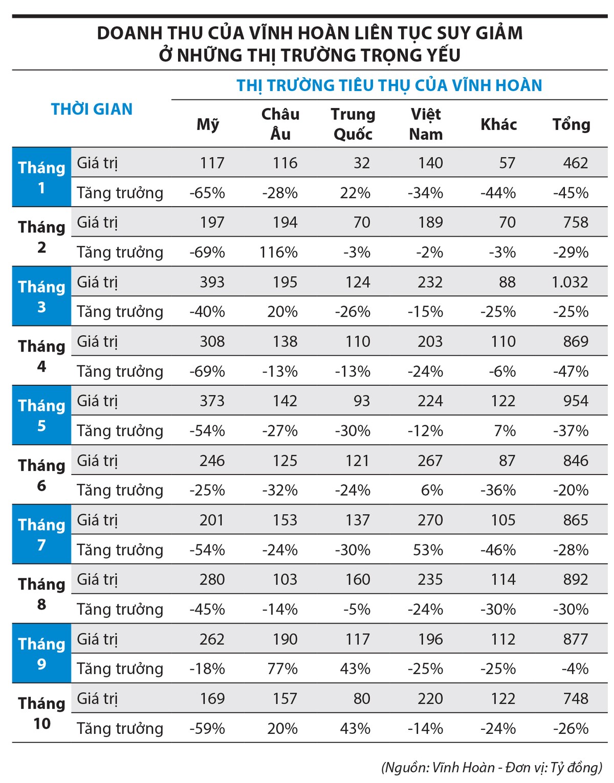 Ngoài ra, doanh thu thị trường Mỹ tháng 5 ghi nhận 373 tỷ đồng, chiếm 39,1% tổng doanh thu, nhưng tới tháng 10 giảm xuống còn 169 tỷ đồng, chiếm tỷ trọng 22,6%. Như vậy, bên cạnh giảm doanh thu so với cùng kỳ, thị trường này còn ghi nhận giảm cả về tỷ trọng trong tổng doanh thu đóng góp cho Vĩnh Hoàn.