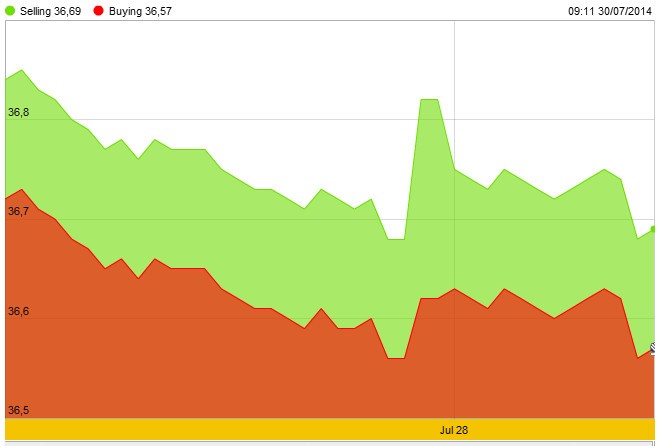 Tại thị trường trong nước, giá vàng SJC sáng nay chỉ kịp phản ánh đợt giá giảm trên thị trường Mỹ đêm qua. Theo đó, giá vàng thương hiệu quốc gia giảm 60.000 đồng/lượng xuống còn 36,56 - 36,68 triệu đồng/lượng khi mở cửa. Đến 9h11, giá tăng nhẹ 10.000 đồng/lượng.