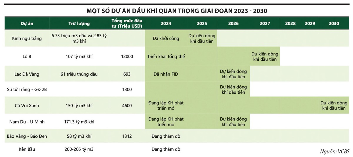 Công ty Chứng khoán Vietcap cho rằng, dự án Lô B sẽ được tiếp tục triển khai do tình trạng thiếu hụt khí đốt trầm trọng của Việt Nam. Vietcap ước tính, mức chi tiêu đối với hoạt động thăm dò và khai thác trong nước năm 2024 sẽ cải thiện 14% so với năm 2023, lên mức 0,8 tỷ USD. Năm 2025, con số này có thể tăng 63%, lên 1,3 tỷ USD và đạt đỉnh ở mức 2,8 tỷ USD vào năm 2027. Mức chi tiêu trung bình trong giai đoạn 2025 - 2029 là 2,1 tỷ USD/năm, gấp 2,6 lần mức trung bình giai đoạn 2015 - 2023.