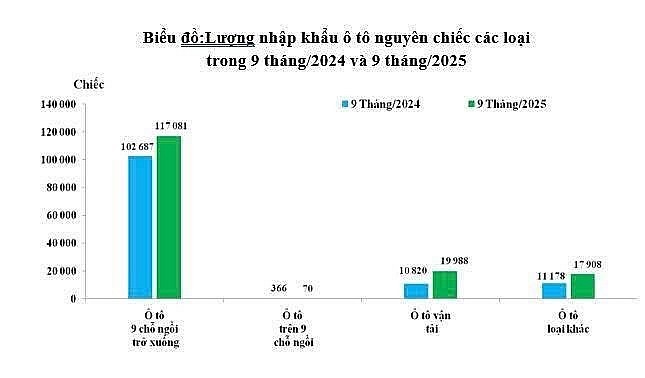 Tính chung 9 tháng năm 2025, cả nước nhập khẩu 155.047 ô tô nguyên chiếc, tăng 24% so với cùng kỳ năm 2024. Trong đó, ô tô dưới 9 chỗ ngồi đạt 117.081 chiếc (tăng 14%), ô tô vận tải đạt 19.988 chiếc (tăng 84,7%).