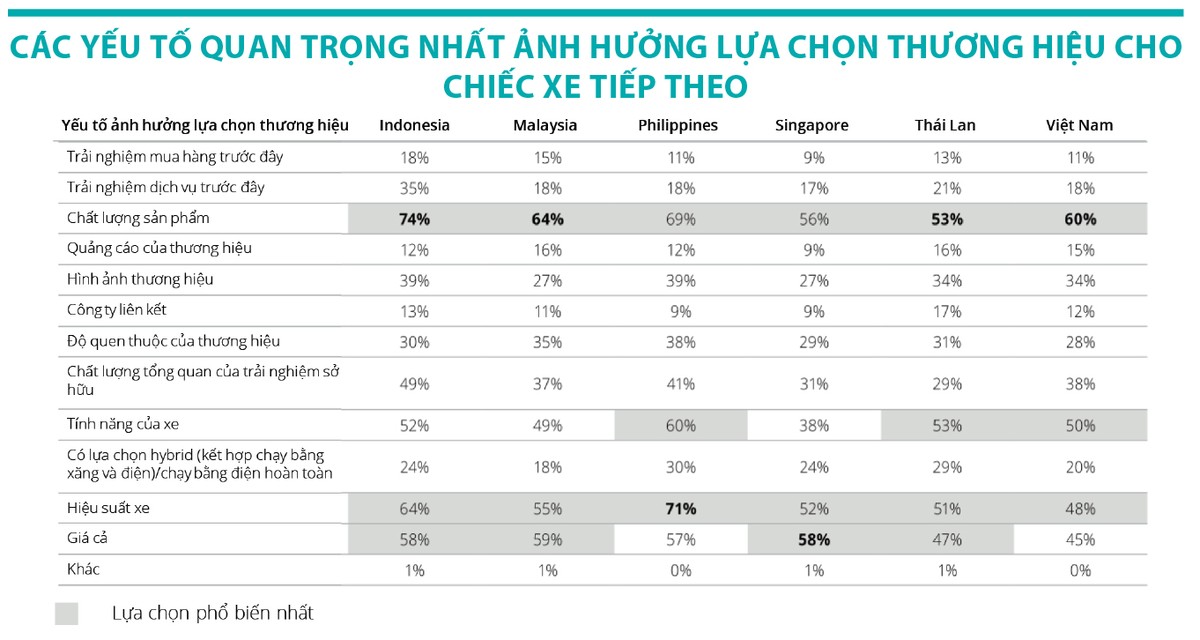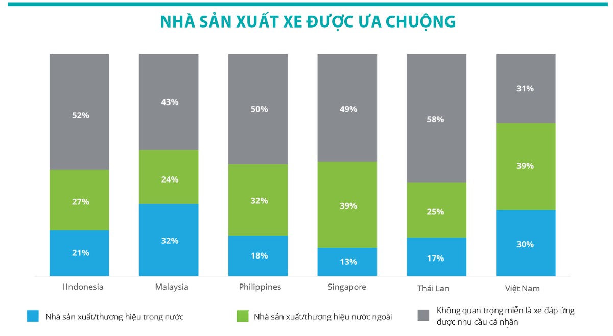 Sự yêu thích của người tiêu dùng với các thương hiệu xe trong nước và nước ngoài khác nhau giữa các thị trường Đông Nam Á, nhưng có một bộ phận người tiêu dùng không quá quan tâm đến thương hiệu, chỉ cần xe có các tính năng đáp ứng được nhu cầu.