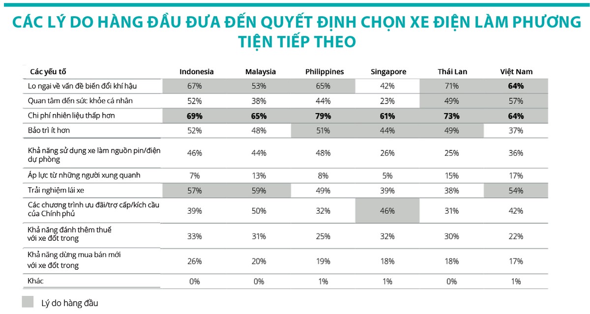 Lý do chính khiến người tiêu dùng lựa chọn mua xe điện xuất phát từ việc giảm chi phí vận hành (xăng, dầu...), vượt xa mối lo ngại về biến đổi khí hậu đối với tất cả các thị trường, ngoại trừ Việt Nam.