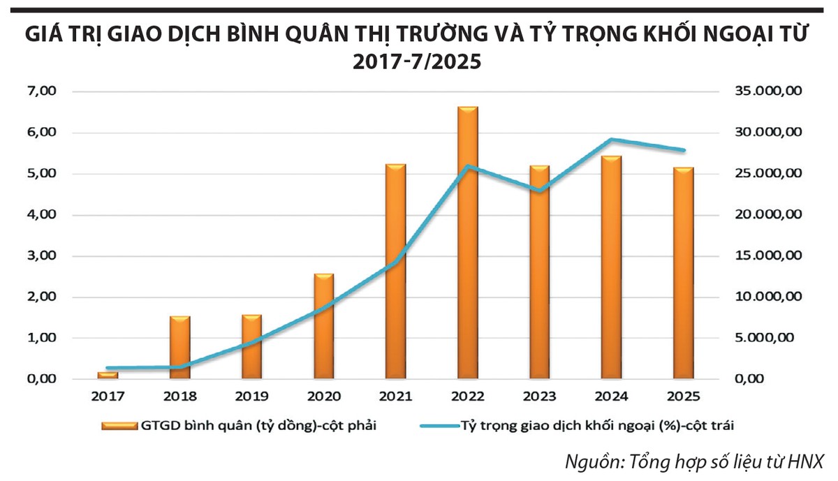 Dù tỷ trọng còn khiêm tốn, sự tham gia của nhà đầu tư nước ngoài có xu hướng tăng. Từ mức bình quân chỉ 0,3% tổng khối lượng giao dịch giai đoạn cuối năm 2017, tỷ trọng này đến năm 2024 đã vượt 5,8% và giữ ổn định cho đến nay.