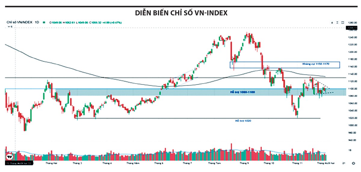 Ngược lại, nhóm vốn hóa vừa và nhỏ nhận được sự quan tâm ngày càng tăng của giới đầu tư, với những nhóm ngành tiêu biểu như dầu khí, cảng biển, thép, khu công nghiệp… Điều này khiến thị trường chung tuy xuất hiện các nhịp sóng nhỏ, nhưng chưa có sự đồng thuận tăng điểm trên diện rộng. Do đó, VN-Index nhiều khả năng sẽ tiếp tục trạng thái lình xình trong vùng 1.080 - 1.130 điểm.
