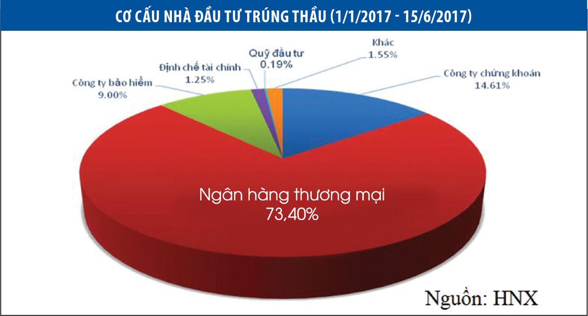 Diễn biến đáng chú ý trên thị trường trái phiếu 6 tháng qua là cơ cấu nhà đầu tư có sự thay đổi theo chiều hướng tích cực. Theo dữ liệu tổng hợp của HNX, tuy nhà đầu tư mua trái phiếu chính phủ chủ yếu vẫn là các ngân hàng thương mại, nhưng tỷ trọng mua của nhóm nhà đầu tư chủ lực này có xu hướng giảm từ mức 82,28% trong năm 2016 xuống còn 73,4% đến thời điểm này. Trong khi đó, tỷ trọng mua của khối công ty bảo hiểm có xu hướng tăng rõ rệt khi chiếm tới 9%.