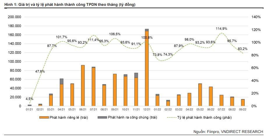 Theo VNDirect, ngay từ thời điểm tháng 3/2022, thị trường TPDN chậm lại nhằm chờ đợi Nghị định sửa đổi Nghị định 153/NĐ-CP/2020, với mục tiêu bảo vệ quyền lợi hợp pháp của nhà đầu tư cũng như nâng cao chất lượng của thị trường vốn. Trong bối cảnh đó, tổng giá trị phát hành TPDN trong 9 tháng 2022 giảm mạnh 43,5% so với cùng kỳ xuống còn 248.603 tỷ đồng; trong đó, 240.804 tỷ đồng phát hành riêng lẻ (-42,2% so với cùng kỳ) và 7.799 tỷ đồng phát hành ra công chúng (-66,8% so với cùng kỳ).