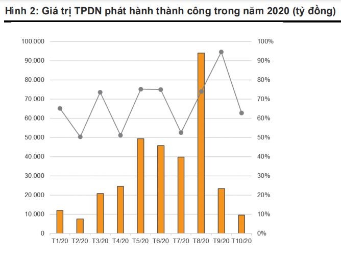 Lũy kế 10 tháng, tổng giá trị trái phiếu doanh nghiệp phát hành thành công đạt 350.883 tỷ đồng, tăng 68,1% so với cùng kỳ năm ngoái, trong đó giá trị trái phiếu phát hành riêng lẻ đạt 326.024 tỷ đồng.