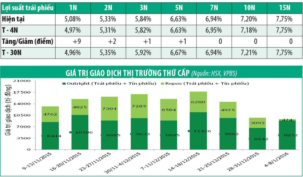 Thị trường trái phiếu chính phủ thứ cấp tuần qua không thực sự sôi động. Tổng khối lượng giao dịch từ 4-8/1 đạt mức 9.326 tỷ đồng, tương đương mức trung bình 1.865 tỷ đồng/ngày, giảm 4,2% so với tuần trước.