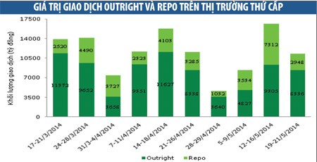 Trên thị trường thứ cấp, từ 19 - 21/5, tổng giao dịch đạt 11.284 tỷ đồng, tăng 13,2% so với tuần trước. Trong đó, giao dịch outright chiếm phần lớn, khoảng 74%. NĐT nước ngoài tiếp tục bán ròng mạnh, đạt khoảng 837 tỷ đồng trong 3 phiên đầu tuần.