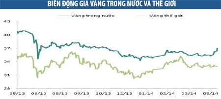Trên thị trường vàng, mặc dù giá vàng thế giới ít biến động và vẫn giao dịch duới 1.295 USD/ounce, nhưng giá vàng trong nước tăng vọt vượt mức 37 triệu đồng/lượng chiều bán ra. Chênh lệch giữa giá vàng trong nước và giá vàng thế giới cũng nới rộng lên hơn 4 triệu đồng/lượng vào ngày 20/5, đây là mức chênh lệch cao nhất tính từ cuối năm ngoái. Tuy nhiên, giá vàng trong nước đã quay đầu giảm mạnh xuống 36,30 - 36,50 triệu/lượng trong ngày 21/5. Theo chúng tôi, giá vàng trong nước giảm mạnh do hoạt động chốt lời khi giá vàng đã tăng quá nóng - đạt mức cao nhất trong 7 tháng, vào ngày trước đó, đồng thời thị trường cũng bình tĩnh hơn sau khuyến cáo của NHNN.