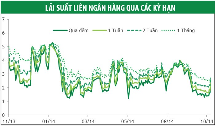 Trong tuần từ 6 - 10/10, lãi suất liên ngân hàng có xu hướng tăng so với tuần trước đó. Chúng tôi cho rằng, tuần từ 13 - 17/10, lãi suất VND liên ngân hàng sẽ tiếp tục đi lên khoảng 30 - 50 điểm, do đã bắt đầu vào quý IV - thời điểm tín dụng bắt đầu tăng tốc. Lãi suất liên ngân hàng đóng cửa ngày 10/10 qua các kỳ hạn tham khảo ở mức: qua đêm (2,1%, +70 điểm theo tuần), 1 tuần (2,3%, +60 điểm), 2 tuần (2,6%, +50 điểm) và 1 tháng (2,8%, +20 điểm).
