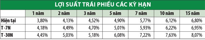 Theo số liệu từ Bloomberg, lợi suất tiếp diễn xu hướng giảm trên tất cả các kỳ hạn. Trái phiếu 1, 2 và 3 năm giảm lần lượt 38, 36 và 18 điểm cơ bản, về mức lợi suất 3,80%/năm, 4,13%/năm và 4,52%/năm. Lợi suất trái phiếu 5, 7, 10 và 15 năm ghi nhận lần lượt tại 4,90%/năm (giảm 11 điểm cơ bản), 5,77%/năm (giảm 16 điểm cơ bản), 6,12%/năm (giảm 10 điểm cơ bản) và 6,80%/năm (giảm 15 điểm cơ bản).