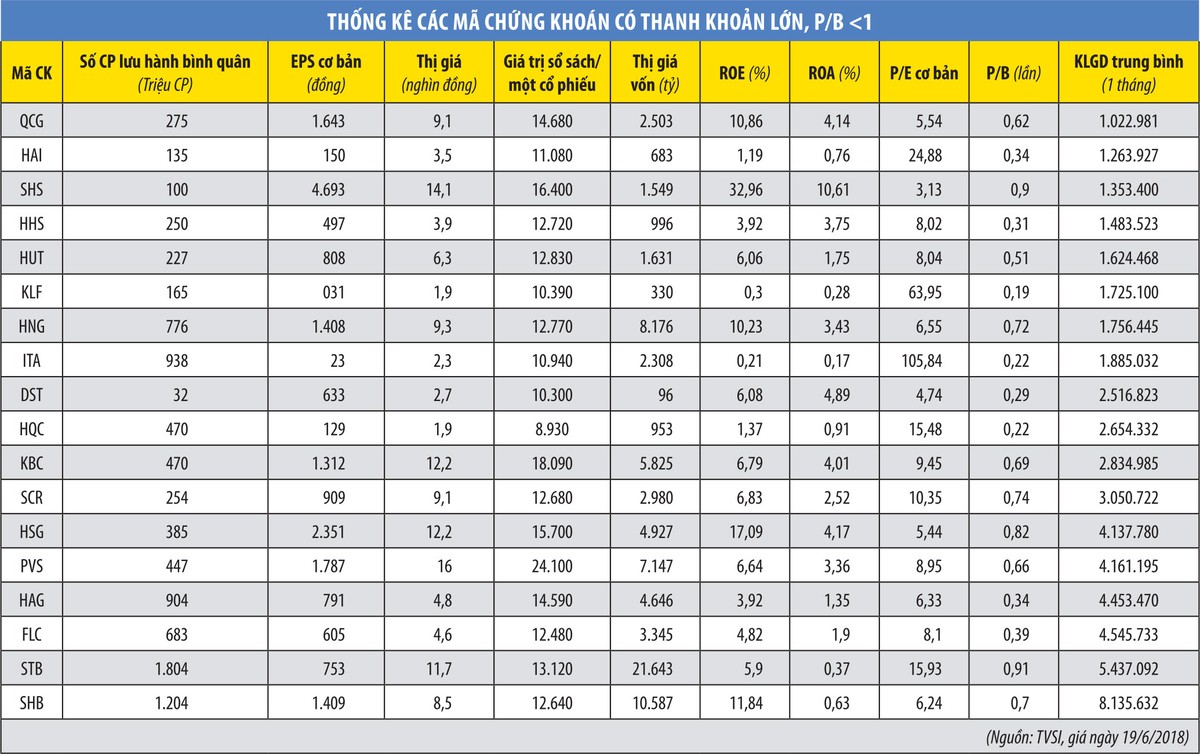 Tuy nhiên, đây không phải là tình trạng chung của các mã có P/B nhỏ hơn 1. Đa số cổ phiếu còn lại có thanh khoản lớn, từ vài trăm nghìn đến hàng triệu cổ phiếu/phiên. Thậm chí, 18 mã trong số này có thanh khoản trung bình 1 tháng qua đạt mức từ 1 triệu cổ phiếu/phiên trở lên, nằm trong nhóm có thanh khoản lớn nhất thị trường.