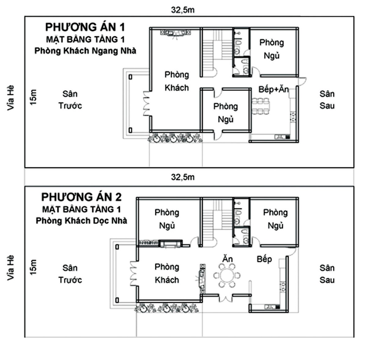 Với yêu cầu công năng tầng 1 gồm: 1 khách, 1 bếp, 1 ăn, 2 ngủ, 2 WC, cầu thang rộng trên 90 cm. Chúng ta thấy ở phương án 1, phòng khách quang ngang nhà thì diện tích lớn quá, bếp và ăn mang tính chất nội bộ, không phù hợp với gia đình có nhiều anh chị em họ hàng và nhiều bạn bè.