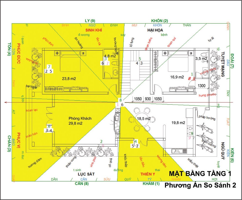 Trong phương án chọn của mặt bằng tầng 1 ở trên, hai phòng ngủ ở tầng 1 được thiết kế diện tích rộng gần như nhau, đều được bố trí 2 giường ngủ trong một phòng, sẽ hữu dụng khi người cao tuổi ốm đau và cần người ngủ cùng để trông nom. Hơn nữa, phong thủy còn tính theo thời vận và hiện nay phòng ngủ phía sau ở cung Đoài (Tuyệt mệnh) là phương Tây, vận 8 (từ năm 1984 đến 2023) thì rất tốt và vận 9 (từ năm 2024 đến 2043) lại rất xấu; phòng ngủ ở phương Đông Nam (cung Tốn) tuy vận 8 có 1 cái giường xấu, nhưng vận 9 lại ổn hơn. Còn xét theo phong thủy Bát trạch thì các phòng đều có ở các phương vị Đông Tứ Trạch và Tây Tứ Trạch, sẽ hợp cho mọi người khi cần. Hơn nữa phương án kiến trúc tầng 1 mới, sẽ có mặt hậu nhà vuông vức hơn, để tránh có người nói phần đuôi mặt bằng tầng 1 tóp hậu.