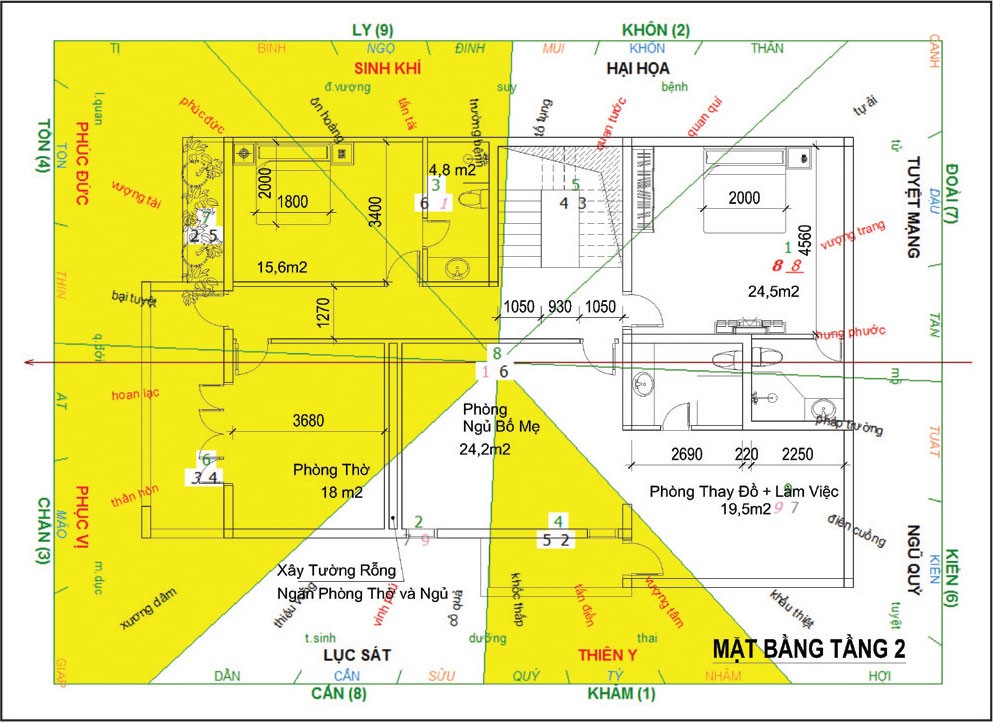 Tiếp đến là thiết kế kiến trúc mặt bằng tầng 2 và áp theo phong thủy, để rồi luận phong thủy tổng quan xem sự hợp lý giữa kiến trúc và phong thủy ra sao.