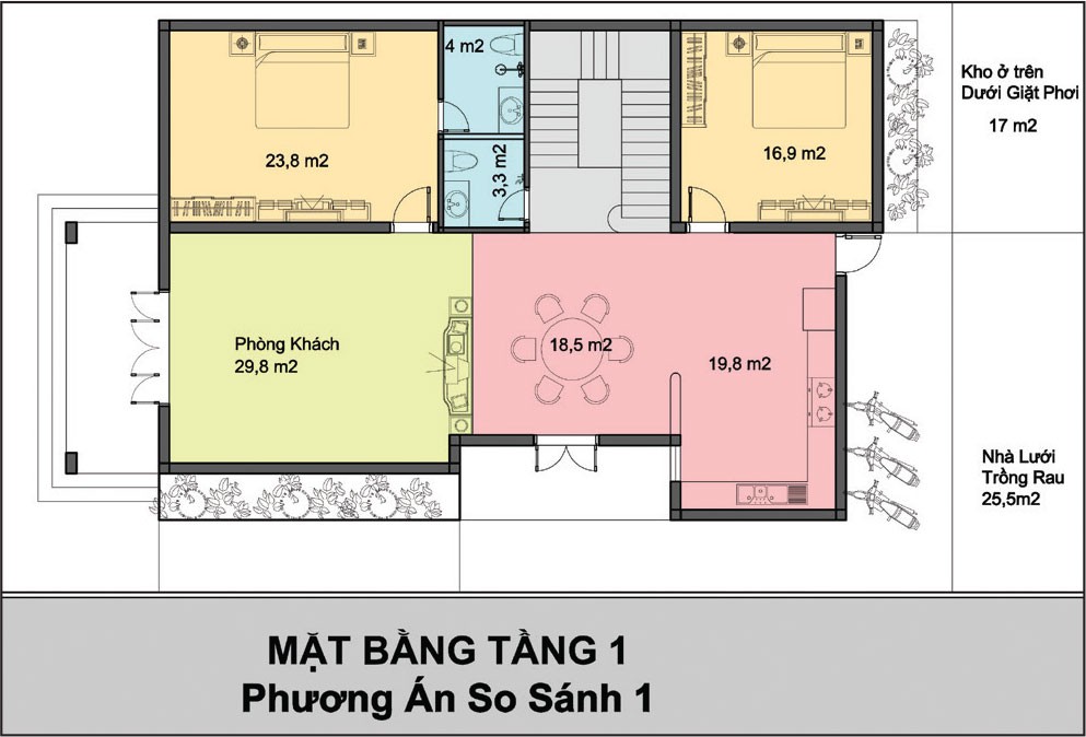 Ở phương án này, cầu thang đi lên thuận chiều kim đồng hồ, vệ sinh khép kín phục vụ phòng ông/bà có diện tích đủ rộng, không gian ăn và bếp đã hợp lý và tiện dụng. Khách đến chơi và ở lại ăn cơm sẽ thuận tiện khi đi vệ sinh.