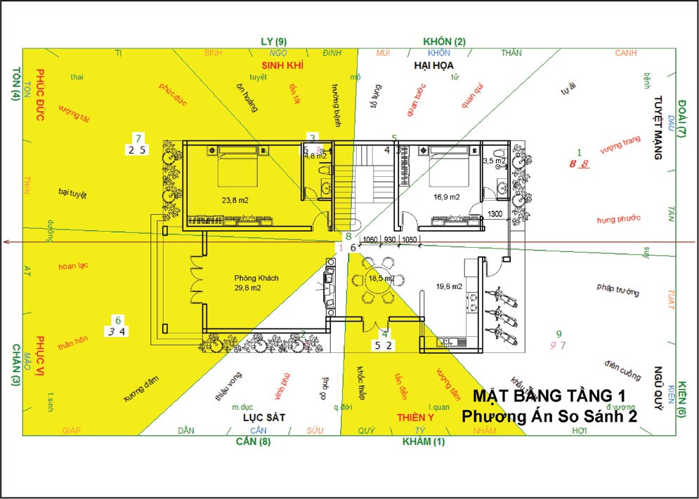 Sau khi được phương án kiến trúc hợp lý hơn, sẽ phải án ngữ vào sơ đồ phong thủy, xem tốt xấu theo phong thủy ra sao: