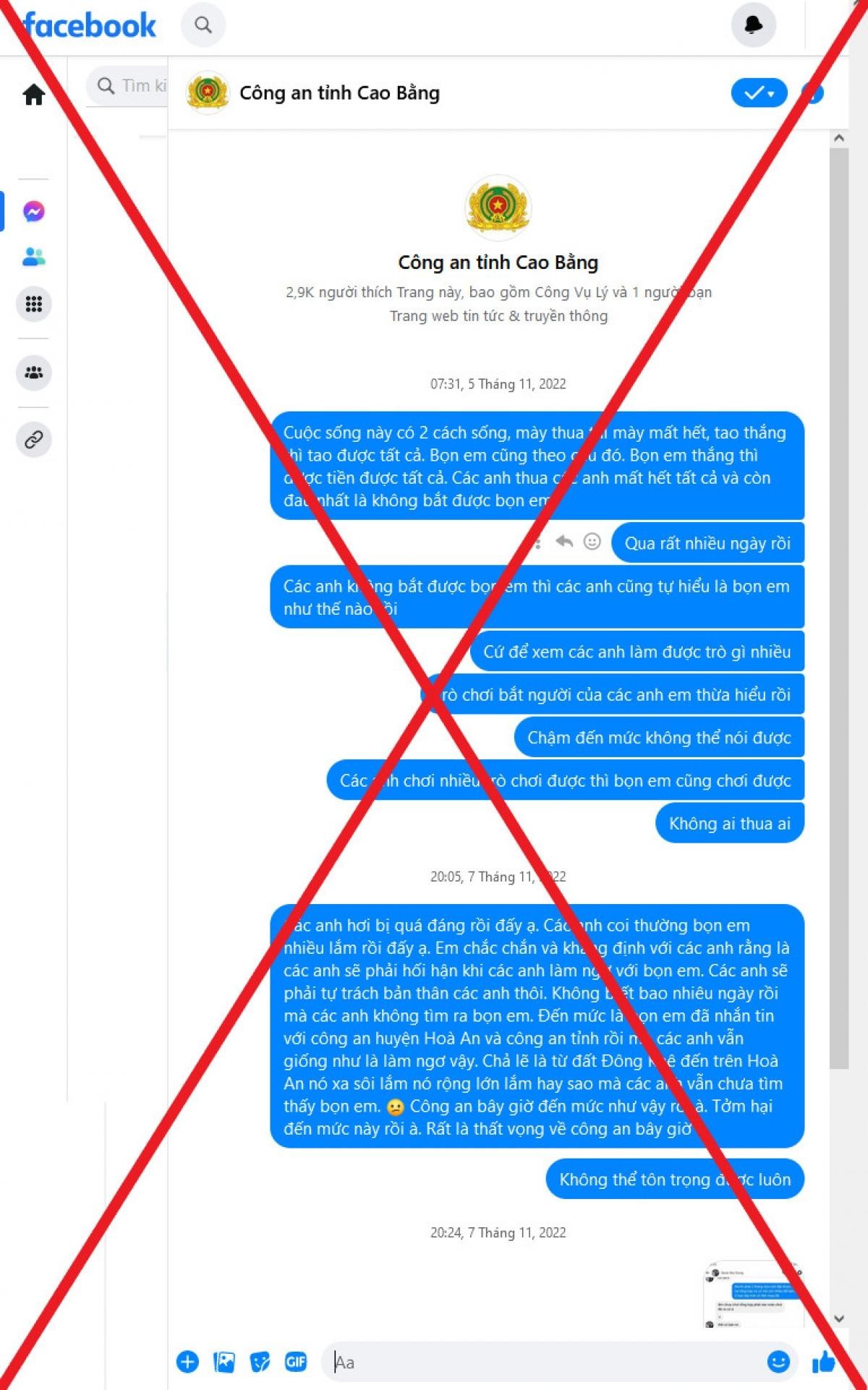 Đầu tháng 11/2022, các tài khoản này tiếp tục đăng tải nhiều bài viết thách thức lực lượng chức năng, thậm chí nhắn tin riêng vào fanpage Facebook chính thức của Công an các cấp trên địa bàn tỉnh Cao Bằng và của Công an các tỉnh, thành phố khác với giọng điệu mỉa mai, thách thức, như: “Bọn em mua bán ma túy, buôn người công khai, đố các anh bắt được”; “Ngày mai băng nhóm sẽ đưa 04 người bán qua biên giới, các anh nhanh mà ngăn chặn” hay “Em đã cho các anh thời hạn mà không bắt được”…