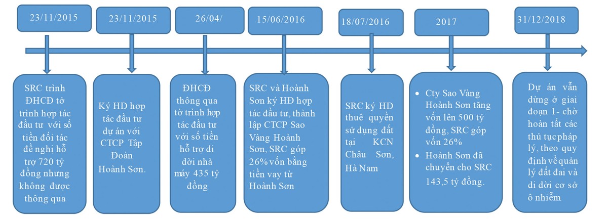 Tính đến cuối năm 2018, vốn điều lệ của công ty dự án đã tăng lên 500 tỷ đồng, trong đó SRC góp 26%, tương đương 130 tỷ đồng bằng tiền vay của Hoành Sơn. Tuy nhiên, sau hơn 2 năm thực hiện, dự án này vẫn đang dừng ở giai đoạn hoàn thiện pháp lý do SRC chưa hoàn thiện được thủ tục theo quy định về quản lý đất đai và di dời cơ sở ô nhiễm môi trường.