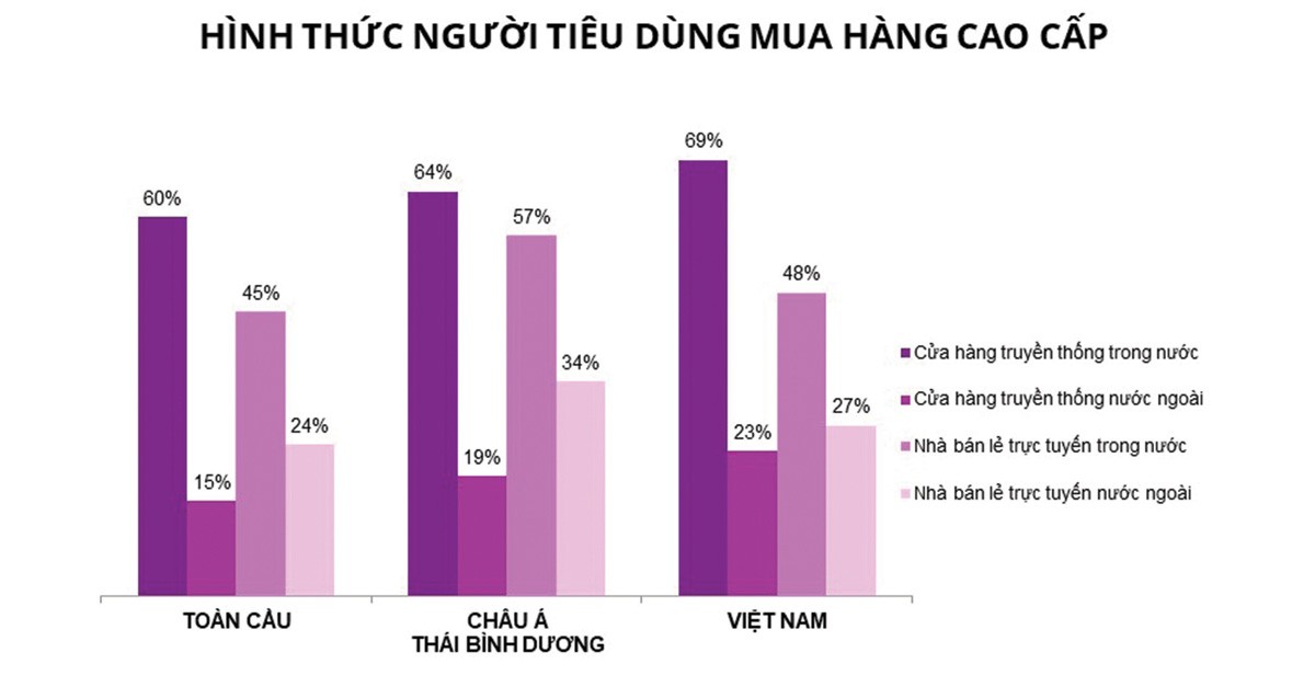 Theo Nielsen, tại Việt Nam, phần lớn người tiêu dùng (69%) vẫn chọn các cửa hàng truyền thống trong nước để mua các sản phẩm cao cấp. Tuy nhiên, gần một nửa người tiêu dùng (48%) đang chuyển sang các nhà bán lẻ trực tuyến trong nước để mua các mặt hàng cao cấp và 27% chọn mua từ các nhà bán lẻ trực tuyến nước ngoài. Trong khi đó, du lịch nước ngoài để mua sắm hàng cao cấp ngay tại cửa hàng là lựa chọn của 23% người tiêu dùng Việt Nam. Thống kê này cho thấy, các cửa hàng trực tuyến tại Việt Nam đang có tốc độ tăng trưởng mạnh.