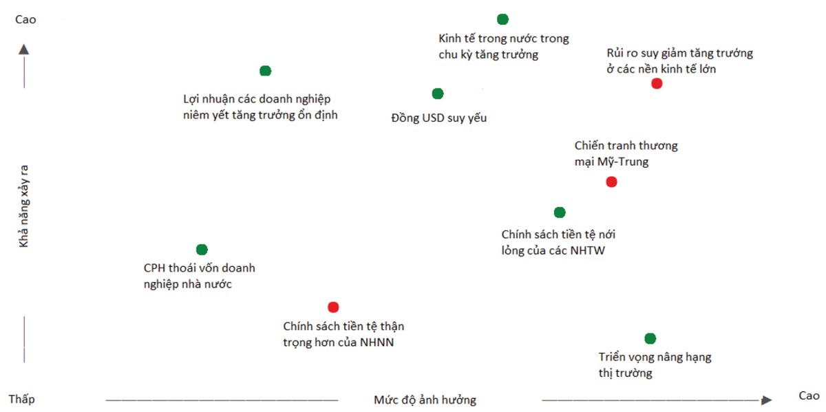 Ở một khía cạnh khác, thị trường sẽ đón nhận nhiều thông tin có tầm ảnh hưởng đến từ ngoại biên. Trong đó, các thông tin chính liên quan đến các vấn đề như đàm phán thương mại Mỹ - Trung, rủi ro tranh chấp thương mại Mỹ - EU, diễn biến đường cong lợi suất của Mỹ, chính sách tiền tệ cũng như các dự báo về triển vọng kinh tế Mỹ, sự kiện Brexit, tăng trưởng kinh tế Trung Quốc, biến động giá dầu... Đây là những yếu tố tác động tương đối khó dự đoán cả về xu hướng lẫn mức độ ảnh hưởng.