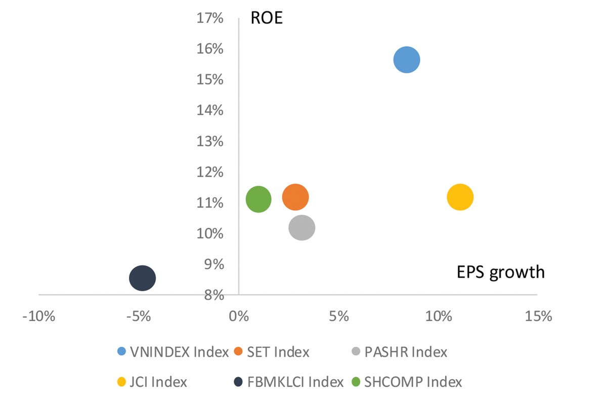 ROE và tăng trưởng EPS bình quân 5 năm các thị trường mới nổi trong khu vực.