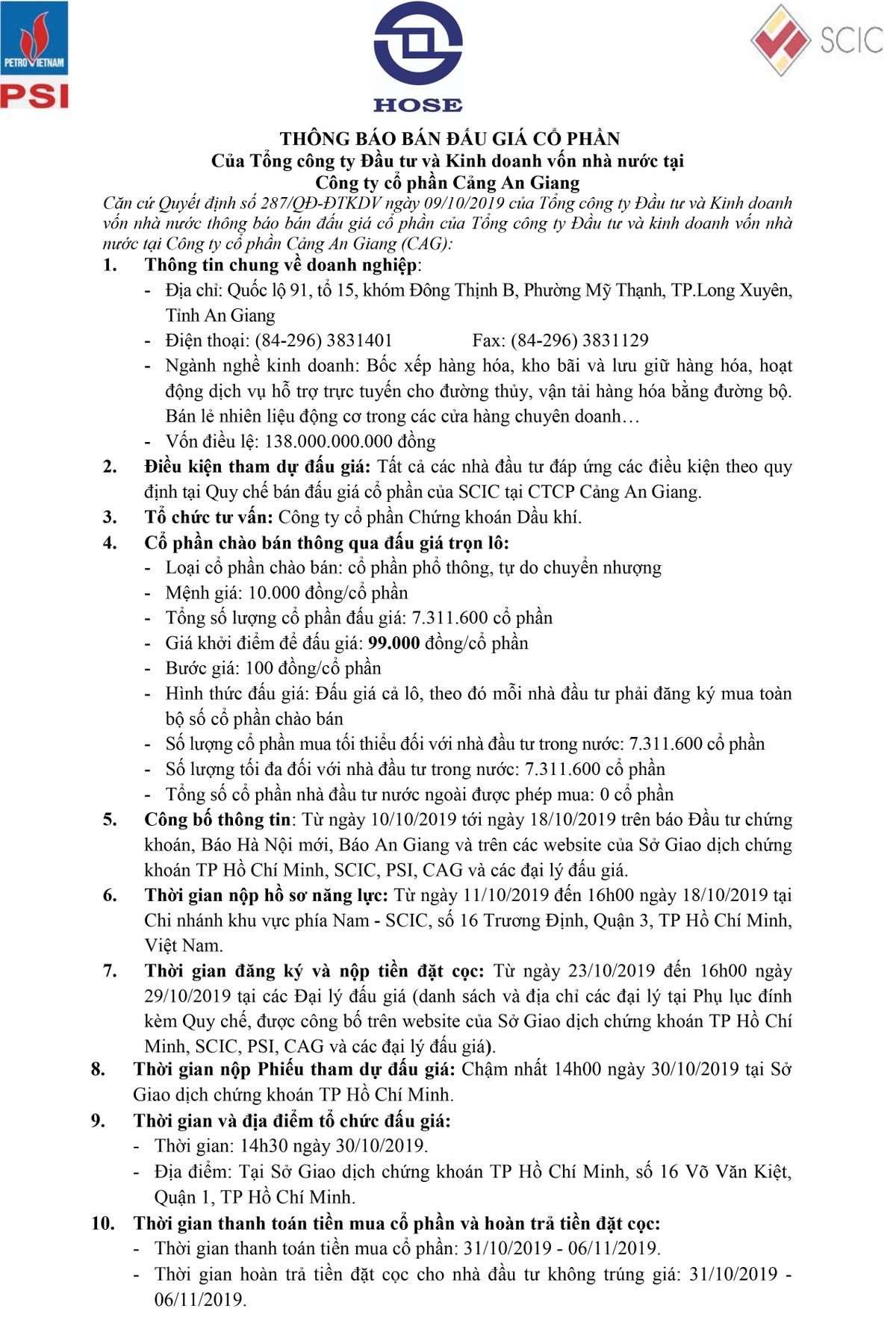 Thông báo bán đầu giá cổ phần của Tổng công ty Đầu tư và kinh doanh vốn nhà nước tại CTCP Cảng An Giang