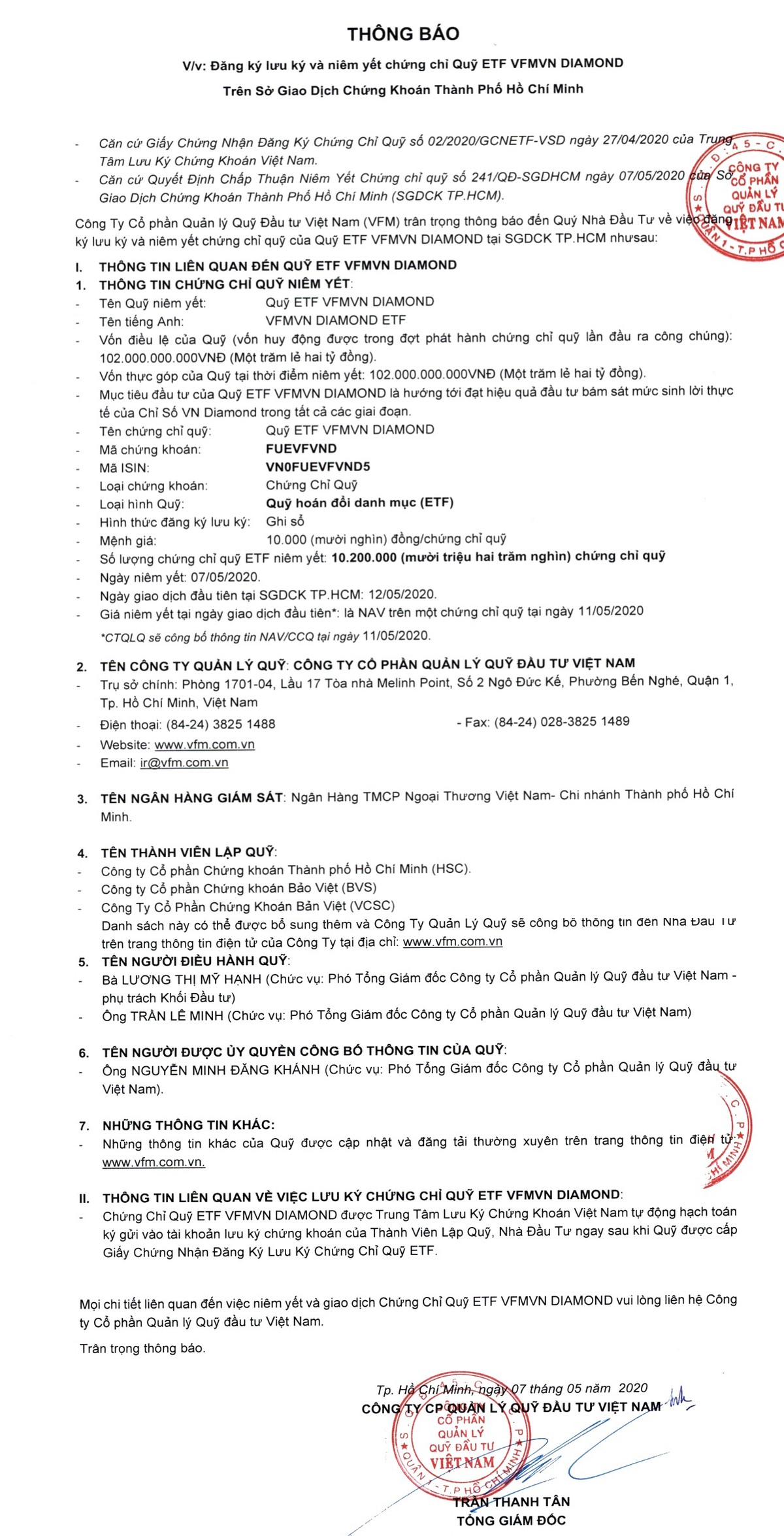 Thông báo đăng ký lưu ký và niêm yết chứng chỉ Quỹ ETF VFMVN DIAMOND trên HOSE