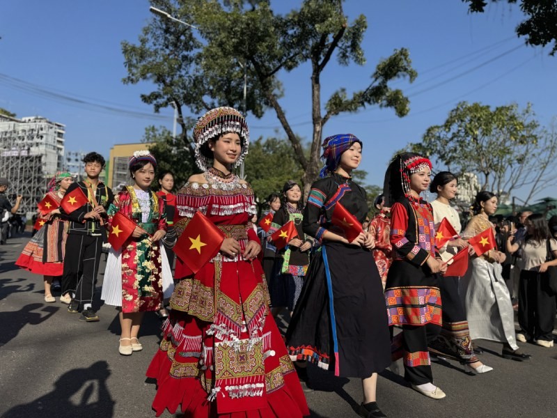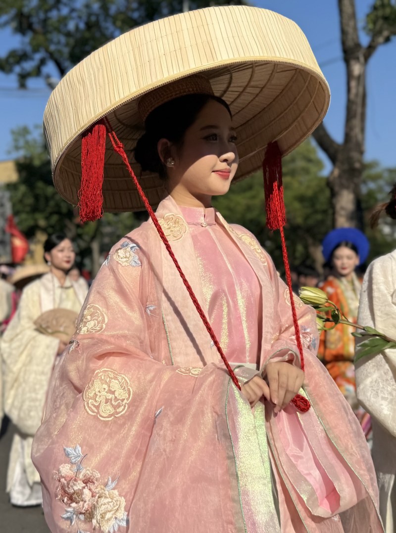 Không khí diễu hành tiếp tục với Ngày hội Việt phục “Bách Hoa Bộ Hành”, quy tụ gần 800 người. Họ khoác lên mình cổ phục Việt Nam qua nhiều thời kỳ cùng áo dài ngũ thân, áo tấc, áo nhật bình và nhiều dạng trang phục truyền thống. Mỗi nhóm trang phục đại diện cho một mảng màu của lịch sử, tái hiện những giai đoạn văn hóa, nghi lễ và đời sống cung đình. Những bước chân hòa nhịp giữa phố đi bộ tạo thành bức tranh di sản sống động, đưa cổ phục đến gần hơn với du khách và cộng đồng.