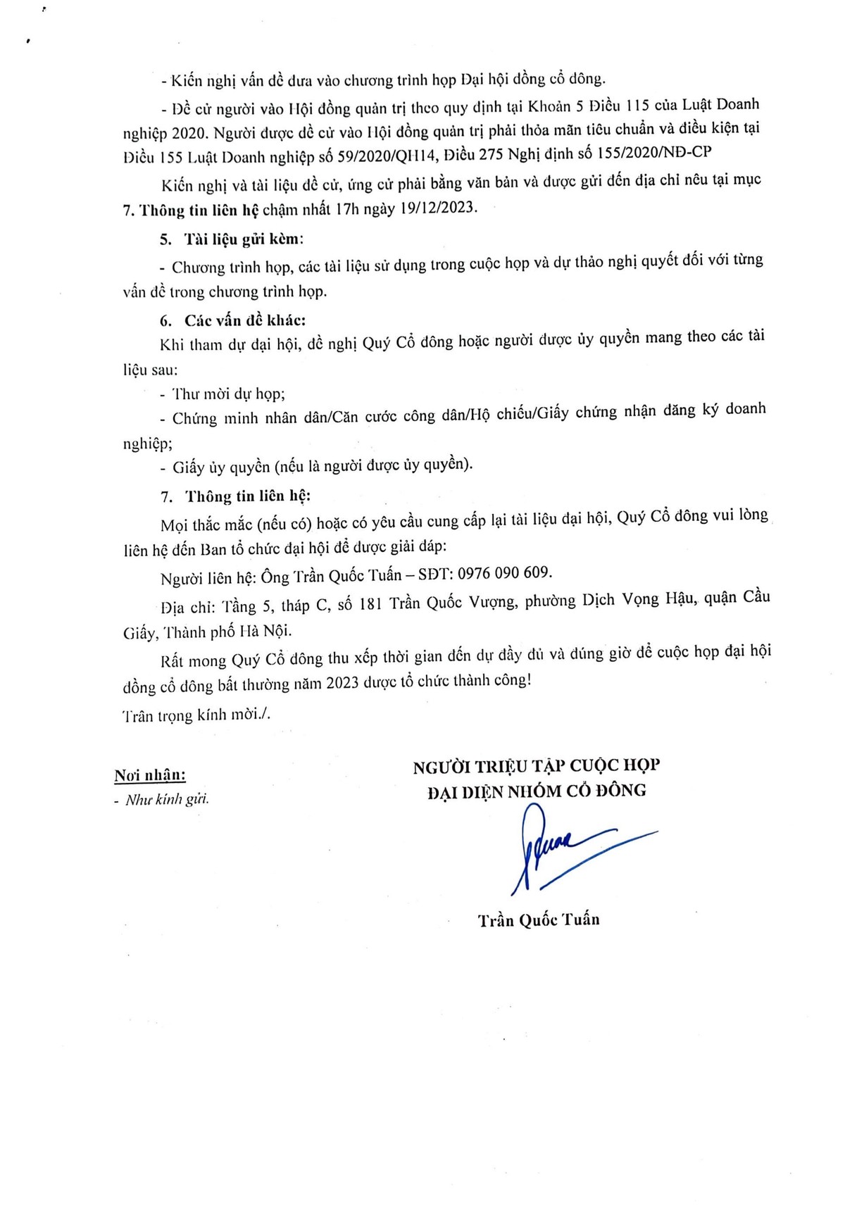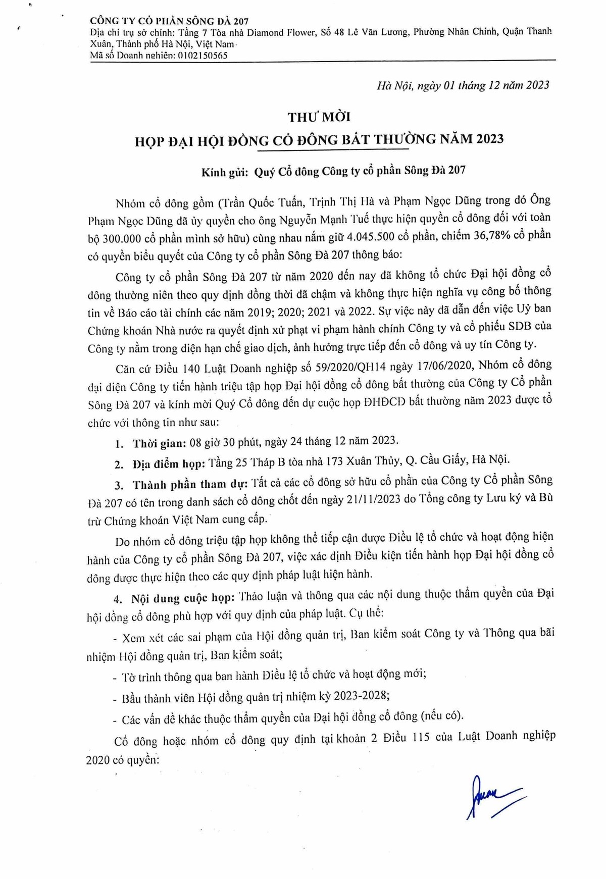 Thư mời họp ĐHĐCĐ bất thường năm 2023 do nhóm cổ đông có quyền đại diện cho CTCP Sông Đà 207 triệu tập theo quy định của Luật Doanh nghiệp