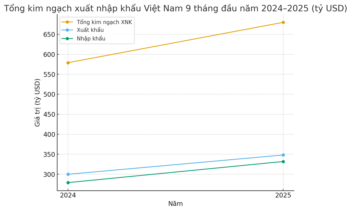 Theo số liệu thống kê mới nhất, tổng kim ngạch xuất nhập khẩu của Việt Nam trong 9 tháng năm 2025 đạt 679,9 tỷ USD, tăng 17,4% (tương ứng tăng 100,9 tỷ USD) so với cùng kỳ năm 2024. Trong đó, kim ngạch xuất khẩu đạt 348,05 tỷ USD, tăng 16,1% (tăng 48,2 tỷ USD), còn kim ngạch nhập khẩu đạt 331,8 tỷ USD, tăng 18,9% (tăng 52,8 tỷ USD).