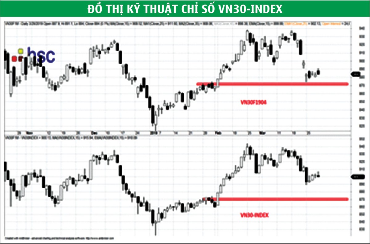 Đáy gần nhất chính là vùng hỗ trợ 860 - 870 điểm trên VN30F1904. Nếu trong các phiên tới, chỉ số chịu nhiều áp lực và lao tới khu vực này thì cơ hội mua sẽ mở ra, lúc đó độ lệch lớn giữa cơ sở và phái sinh là một điểm cộng cho vị thế mua. Trong kịch bản đi theo xu hướng, những nhịp hồi phục kỹ thuật lên khu vực kháng cự 895 - 900 điểm sẽ mở ra cơ hội bán. Một lưu ý nhỏ là độ chênh lệch giữa phái sinh và cơ sở phải nhỏ hơn 10 - 12 điểm thì mới cân nhắc tham gia bán để hạn chế rủi ro.