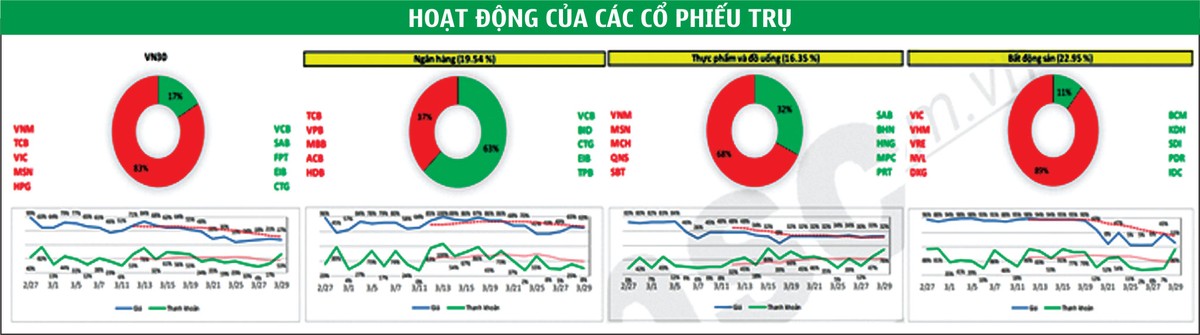 Sự đồng thuận ở các cổ phiếu trụ là tương đối kém trong tuần qua. Rổ VN30 vẫn có tới 83% các cổ phiếu đang trong xu hướng giảm, gánh nặng từ VNM, TCB, VIC, MSN và HPG đang khiến nỗ lực hồi phục của chỉ số rất khó khăn. Trong khi đó, những phiên tăng của chỉ số chỉ xuất hiện ở nỗ lực riêng lẻ từ VCB, CTG hay VHM.