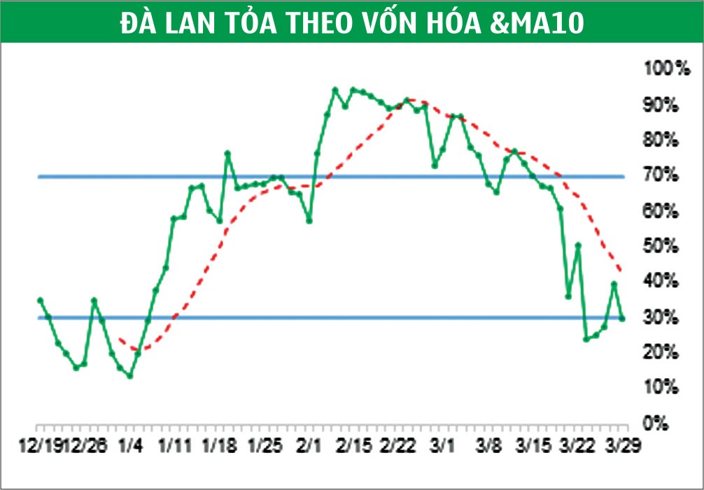 Ngoài ra, đà lan tỏa vẫn chưa lao tới vùng đáy cũ là khu vực 10 - 15% (hiện tại đang là 30%) và đà lan tỏa trung bình 10 phiên (MA10) vẫn chưa lao tới khu vực quá bán, vì thế thị trường có thể sẽ còn chịu những rung lắc tiếp theo nữa trong những phiên tới.