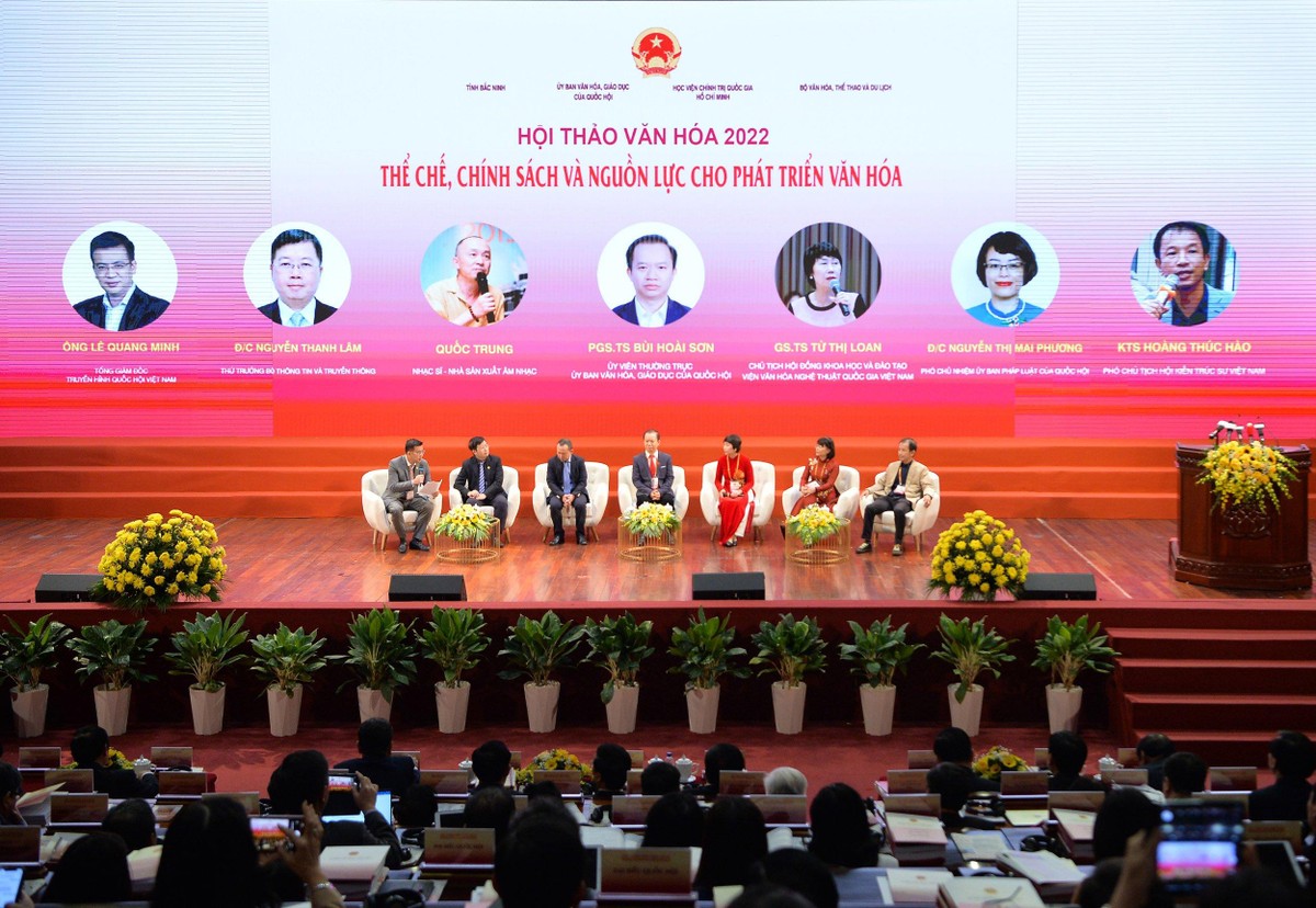 Sau phiên Khai mạc và tham luận, nửa cuối buổi sáng 17/12/2022 diễn ra phiên thảo luận chủ đề “Thể chế, chính sách và nguồn lực cho phát triển văn hóa”.
