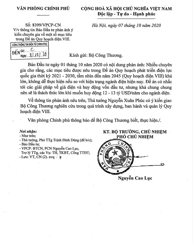 Về thông tin phản ánh nêu trên, Thủ tướng Chính phủ có ý kiến giao Bộ Công Thương nghiên cứu trong quá trình xây dựng, ban hành và quản lý Quy hoạch điện VIII.