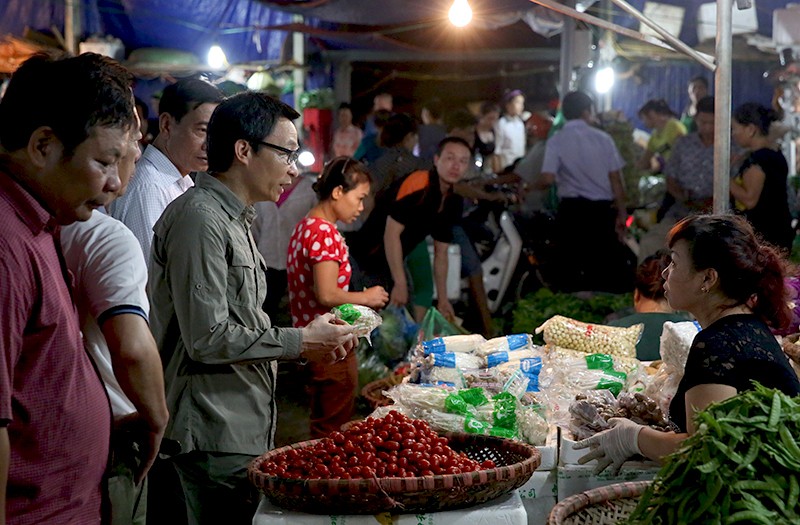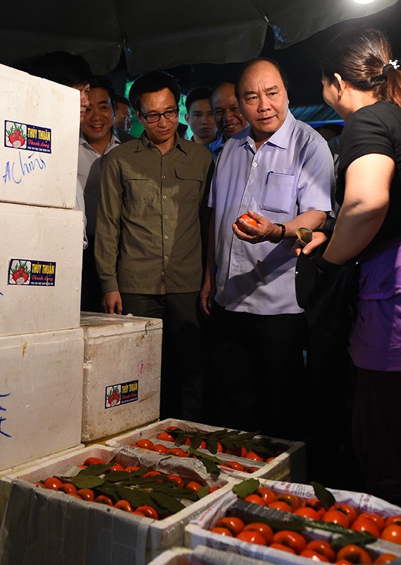 Thủ tướng Nguyễn Xuân Phúc, Phó Thủ tướng Vũ Đức Đam đã đến thăm một số quầy hàng, trò chuyện với các tiểu thương kinh doanh, buôn bán tại chợ.