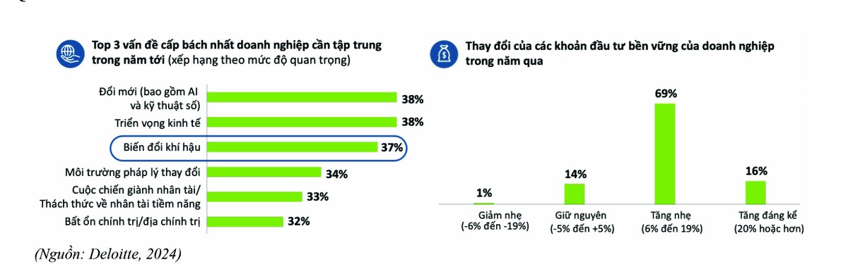 Theo một nghiên cứu được Deloitte thực hiện vào tháng 5-6/2024 với việc khảo sát hơn 2.100 giám đốc cấp cao toàn cầu của các công ty có doanh thu tối thiểu đạt 500 triệu USD/năm cho thấy, biến đổi khí hậu vẫn nằm trong Top 3 vấn đề cấp bách nhất; 85% doanh nghiệp đã gia tăng đầu tư vào bền vững thời gian qua.