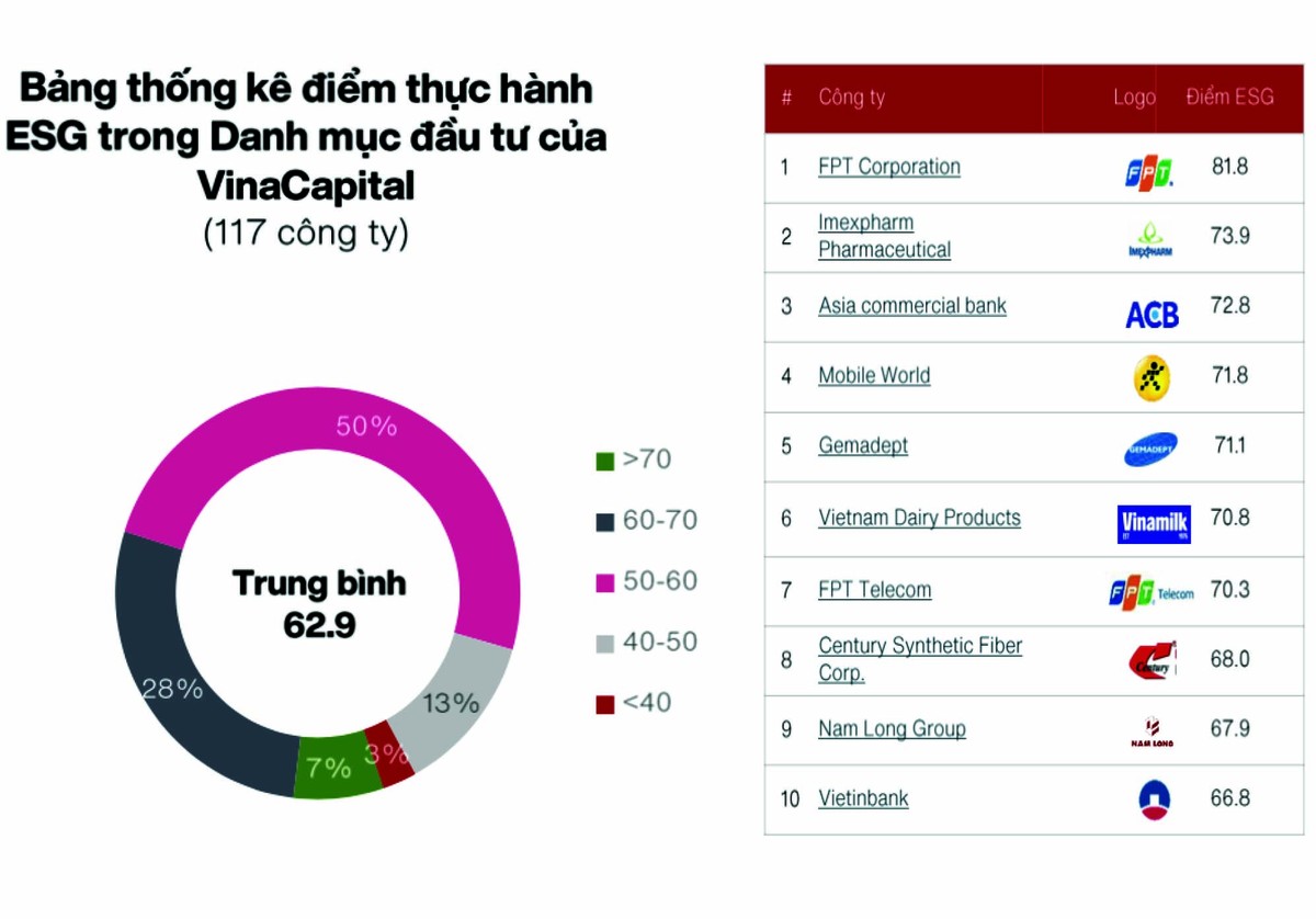 Đơn cử, VinaCapital đã dành tới 66% danh mục đầu tư cho các doanh nghiệp có điểm thực hành ESG cao trên 50 điểm (điểm trung bình là 62,9 điểm).