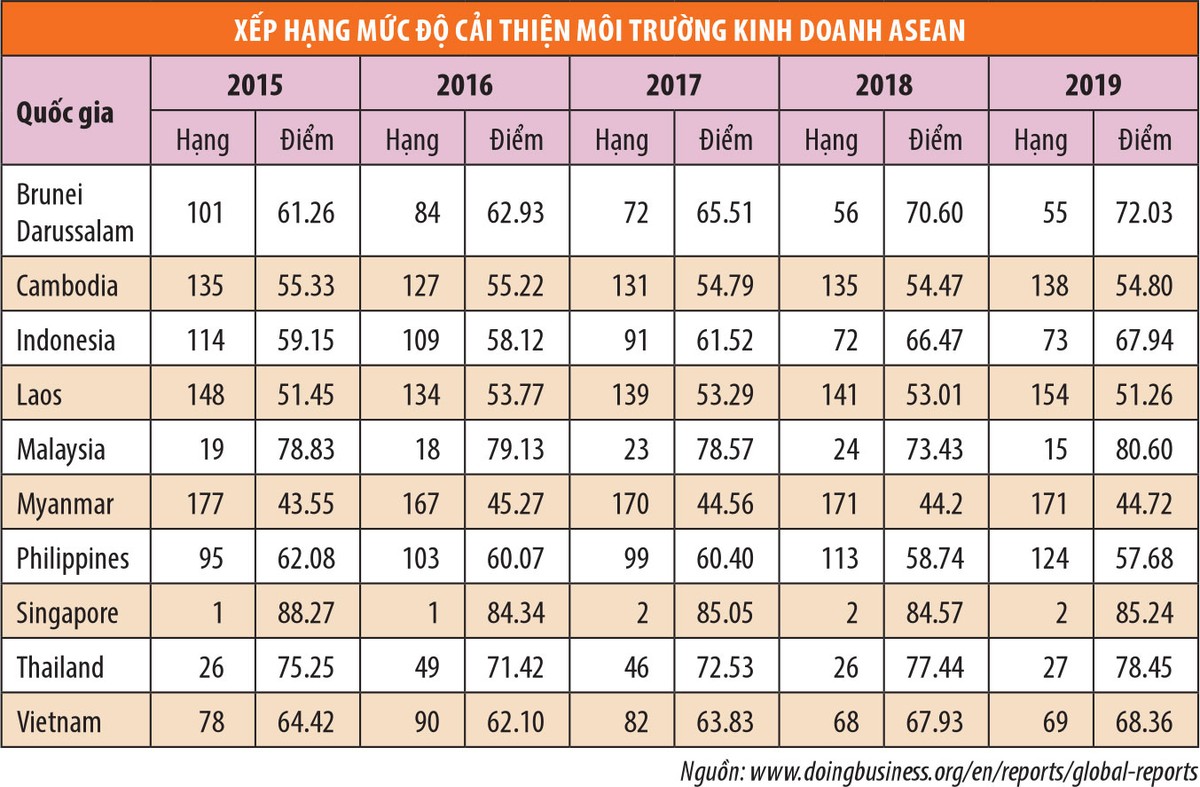 Trong giai đoạn 2015 - 2018, theo xếp hạng của Ngân hàng Thế giới, môi trường kinh doanh Việt Nam liên tục nằm trong nhóm 4 nước có thứ hạng cao nhất của 10 nước ASEAN với điểm số tuyệt đối tăng lên liên tục từ 64,42 điểm lên 68,36 điểm (Bảng 1).