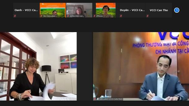 Bà Elsbeth Akkerman, Đại sứ Hà Lan tại Việt Nam và ông Nguyễn Phương Lam, Giám đốc VCCI Cần Thơ ký kết trực tuyến Chương trình hành động 2021 của Nền tảng kinh doanh bền vững Hà Lan – Việt Nam tại khu vực