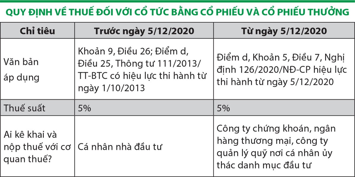 Nghị định số 126/2020/NĐ-CP quy định, trách nhiệm kê khai và khấu trừ thuế từ đầu tư vốn đối với cổ tức bằng cổ phiếu, cổ phiếu thưởng thuộc về “công ty chứng khoán, ngân hàng thương mại nơi cá nhân mở tài khoản lưu ký, công ty quản lý quỹ nơi cá nhân ủy thác danh mục đầu tư” (gọi tắt là đơn vị khấu trừ).