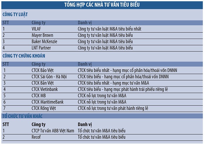PGS. TS Vũ Anh Dũng, Phó hiệu trưởng Trường đại học Kinh tế (Đại học Quốc gia Hà Nội), Chủ tịch Hội đồng thương vụ và nhà tư vấn M&A tiêu biểu cho biết, trong số gần 100 thương vụ và công ty được đề cử, Hội đồng bình chọn đã bỏ phiếu lựa chọn ra 36 thương vụ và công ty, chia thành các hạng mục: Nhóm thương vụ M&A tiêu biểu; Nhóm đơn vị tư vấn M&A tiêu biểu; Nhóm đơn vị cổ phần hóa tiêu biểu; Công ty có chiến lược M&A tiêu biểu.