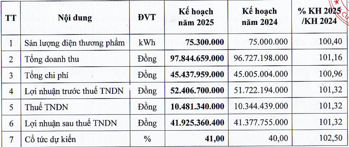Năm 2025, Thuỷ điện – Điện lực 3 đặt mục tiêu cho tất cả các chỉ tiêu chỉ tăng nhẹ từ 1 – 2% so với kế hoạch năm 2024. Trong đó, chỉ tiêu sản lượng điện thương phẩm đạt 75,3 triệu kWh; tổng doanh thu đạt hơn 97,8 tỷ đồng; lợi nhuận sau thuế đạt xấp xỉ 42 tỷ đồng.